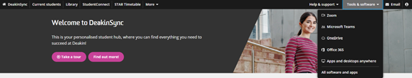 On the desktop version of DeakinSync, go to the Tools & Software menu located on the top right-hand corner of the page.