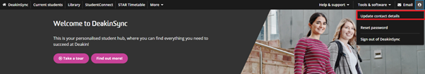 You can update your contact details through DeakinSync.1. Click on the User menu on the top right-hand corner of DeakinSync.