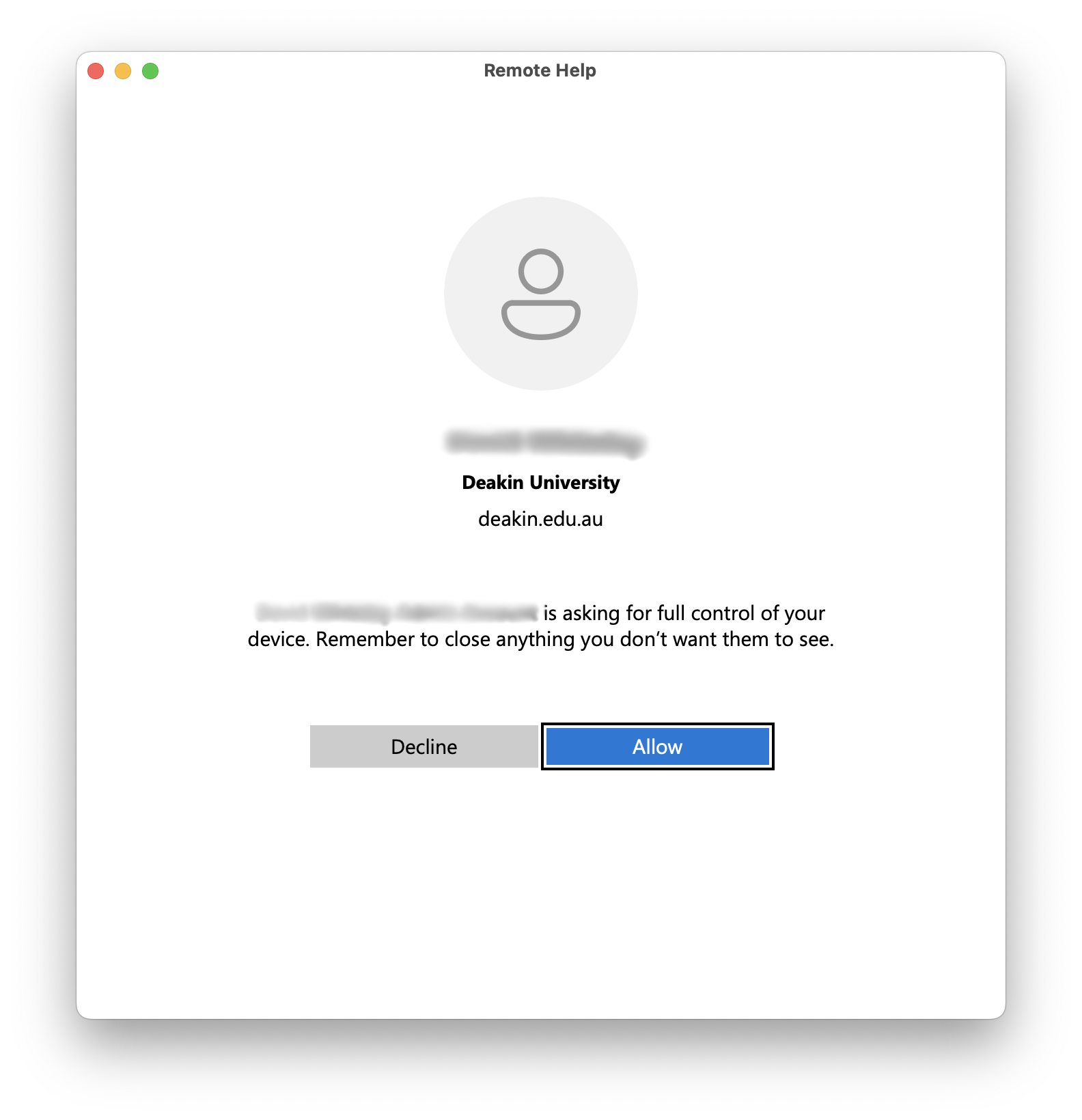Microsoft Remote Help enables Digital Services support staff to assist you remotely by sharing your screen securely and without needing to connect to Deakin's VPN.
