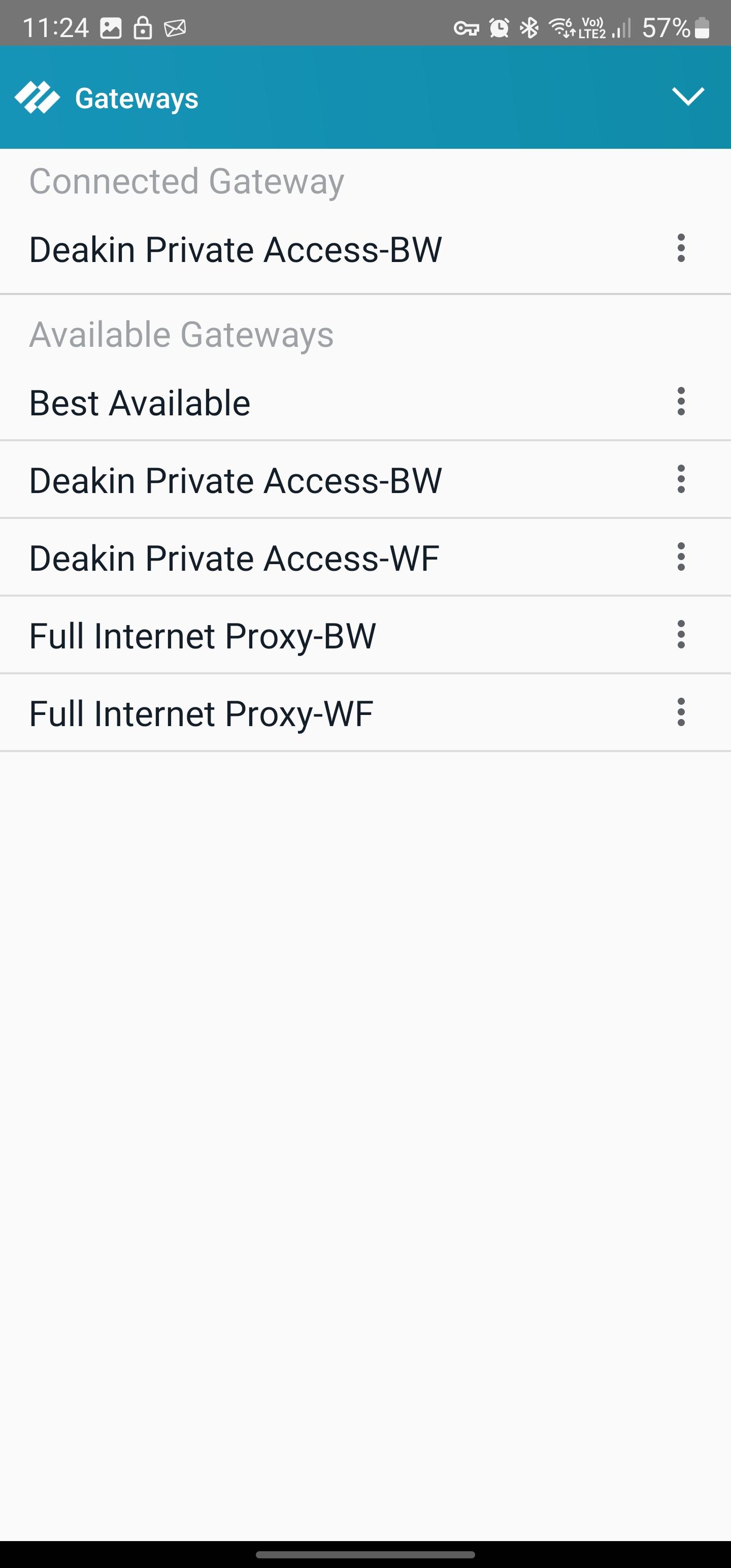 The GlobalProtect uses a network discovery method to select the best available gateway from the multiple available gateway options ('Deakin Private Access-BW', 'Deakin Private Access-WF', 'Full Internet Proxy-BW' and 'Full Internet Proxy-WF').