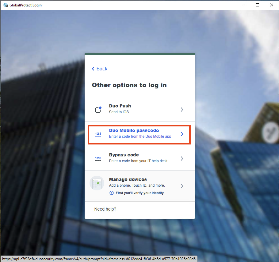 Select 'Other Options' on the Duo Push page, then choose 'Duo Mobile passcode'