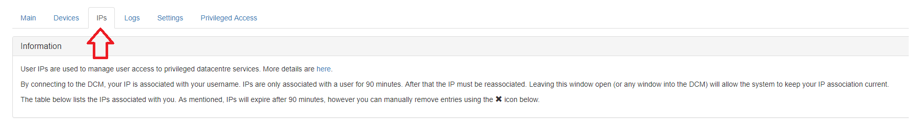 Access to privileged data centre services is managed by the user's IP address. When connecting to DCM your IP address is associated with your username, this can be viewed to the left of the username in the top menu bar.The IP only remains associated with the username for 90 minutes and after that it must be re associated. Leaving any DCM window open will allow the system to keep your IP association current automatically.