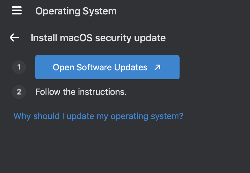 Below is a macOS example Health Check Alert with Remediation Guidance