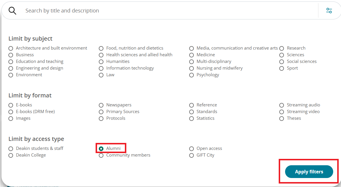 - The filter options pop up will display. Select Alumni under the ‘Limit by access type’ heading. You can also filter by subject and/or format if you want.