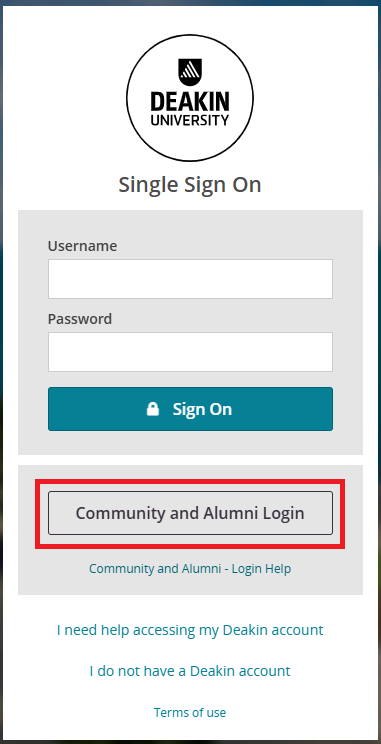 - At the bottom of the authentication pop-up select, Community and Alumni Login.
