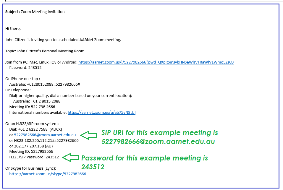 Here is another example Zoom Meeting where the meeting host has not purchased the 'Zoom Room Connector' feature, so the SIP and H.323 addresses are missing from the meeting invitation