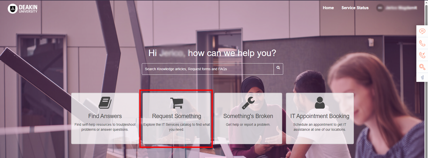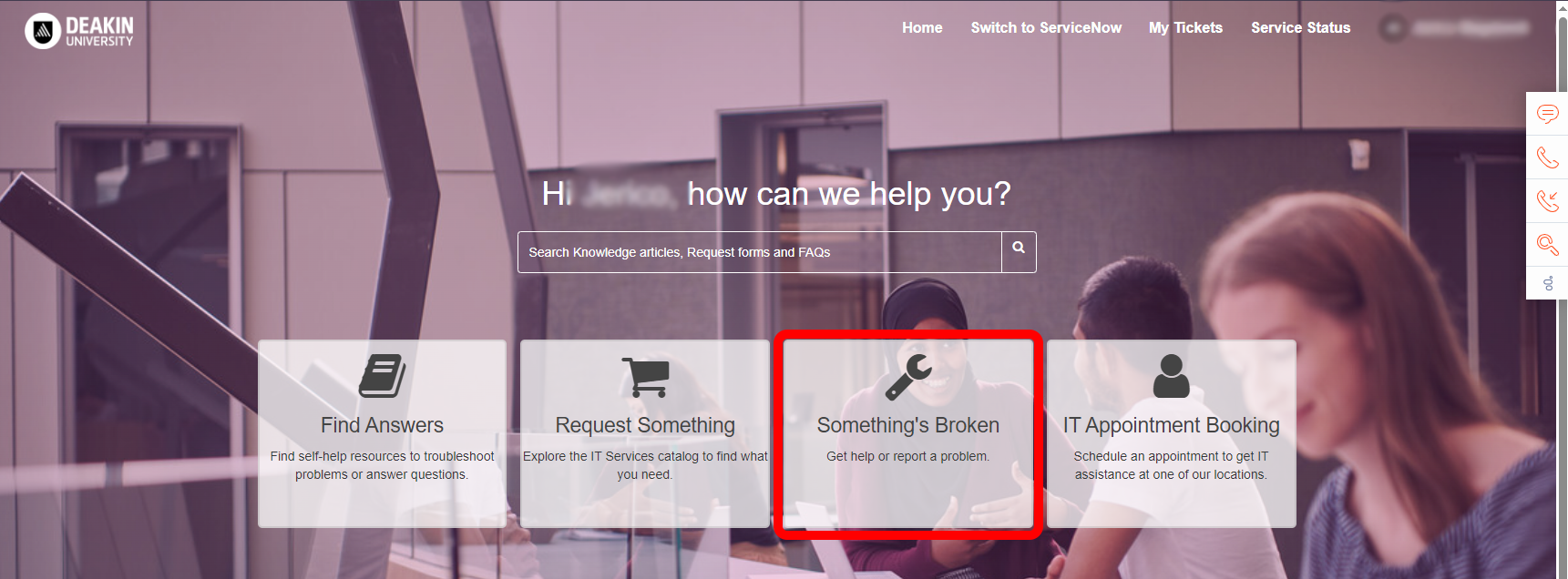 Staff and Students can log requests via the IT Support Page by submitting a service request, or incident.