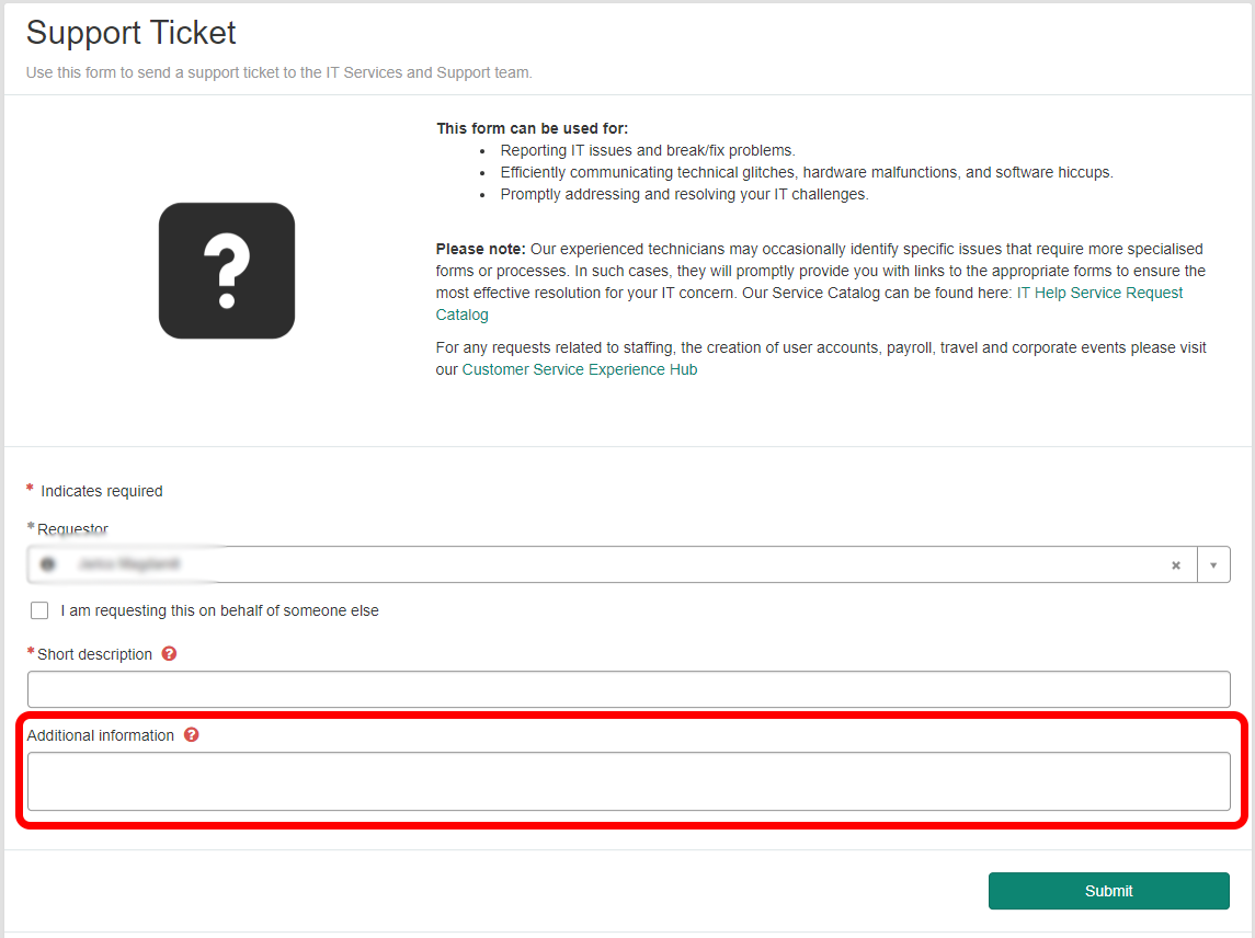 Please offer as much information as you can, as this allows the IT Service Desk to gain more insight into helping you promptly and efficiently.