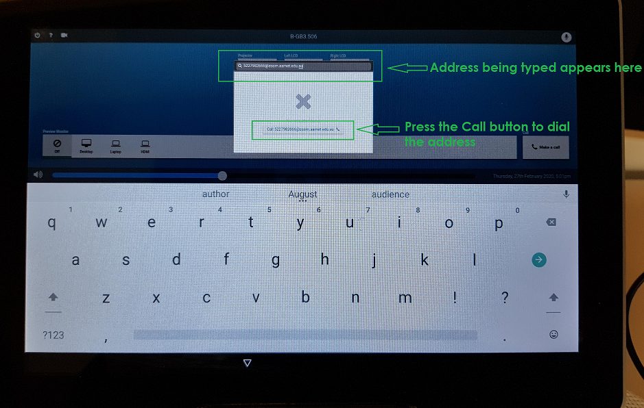 Tip: If the Zoom address you are dialling has a '@zoom.aarnet.edu.au' domain, you may dial the shortcut domain of '@zaa'.