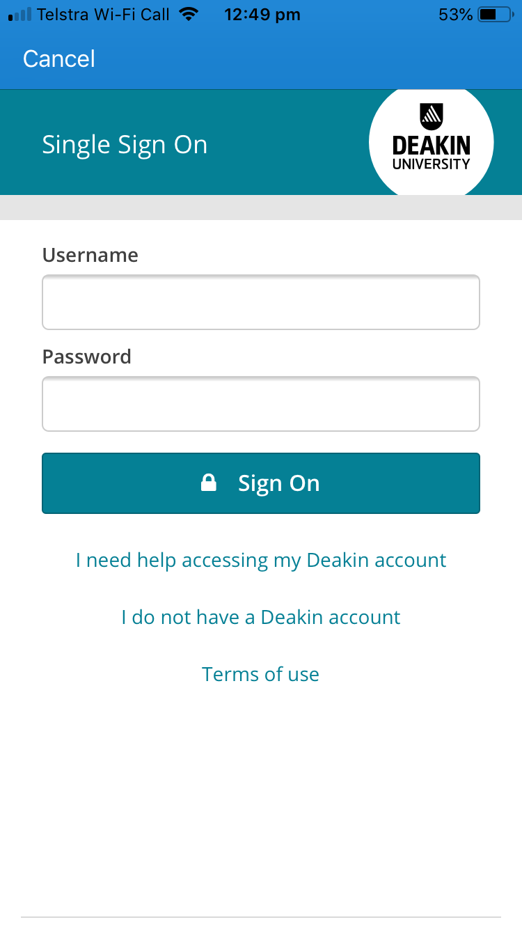 4. Deakin's Single Sign In card appears. Enter your Deakin username and password and tap Sign On.